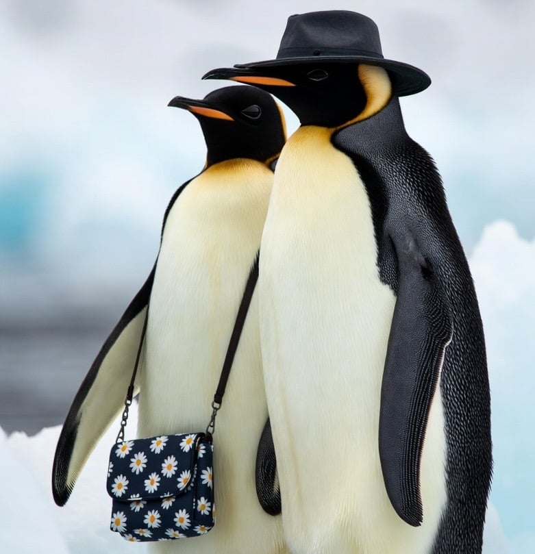 Poppy wears his stylish fedora while Penny carries her daisy purse, traveling the world one landmark at a time.